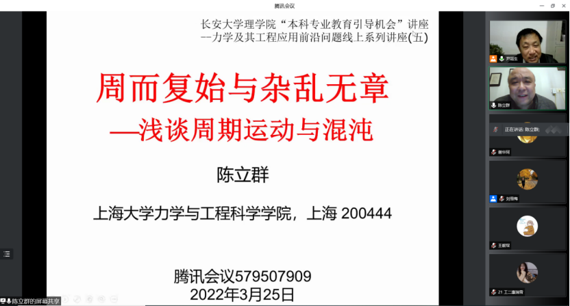 2022年3月25日19:00,上海大学陈立群教授应邀,通过腾讯会议为williamhill官网师生作了题为“周而复始与杂乱无章:浅谈周期与混沌运动”的学术报告。本次报告会由尹冠生教授主持,williamhill体育在线登录及其他学院部分教师、工程力学系研究生和本科生参加了此次报告会。