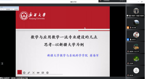 报告以新疆大学“数学与应用数学”一流专业建设为例,从一流专业申报和一流专业建设的意义、思路和实践两个方面展开,特别在一流专业建设实践部分,蒋海军教授介绍了以课程建设为基础,以师资队伍建设为关键,以学科建设为抓手,以质量提升为目标,建设国家一流专业的经验和体会。会后的交流环节,部分教师从数学专业课建设、一流专业评估、数学专业建设与学校特色结合等方面提问,蒋海军教授给予了详细的解答和建议。