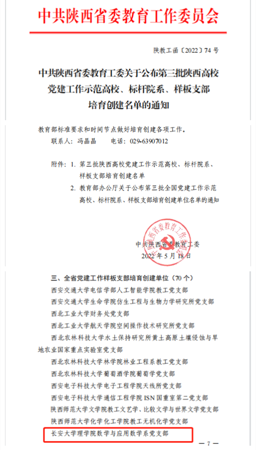 近日,《中共陕西省委教育工委关于公布第三批陕西高校党建工作示范高校、标杆院系、样板支部培育创建名单的通知》(陕教工函〔2022〕74号)发布,williamhill官网数学与应用数学系党支部顺利入选“全省党建工作样板支部培育创建单位”。