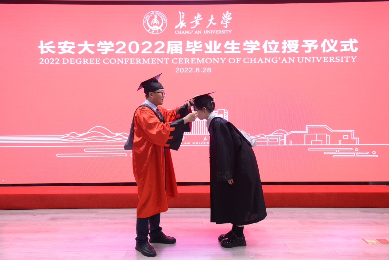 院党委书记闫永刚宣读了关于授予2022届本科毕业生学士学位的决定,学院学位评定分委员会主席、院长宋学力为毕业生拨穗正冠、颁发学位证书。