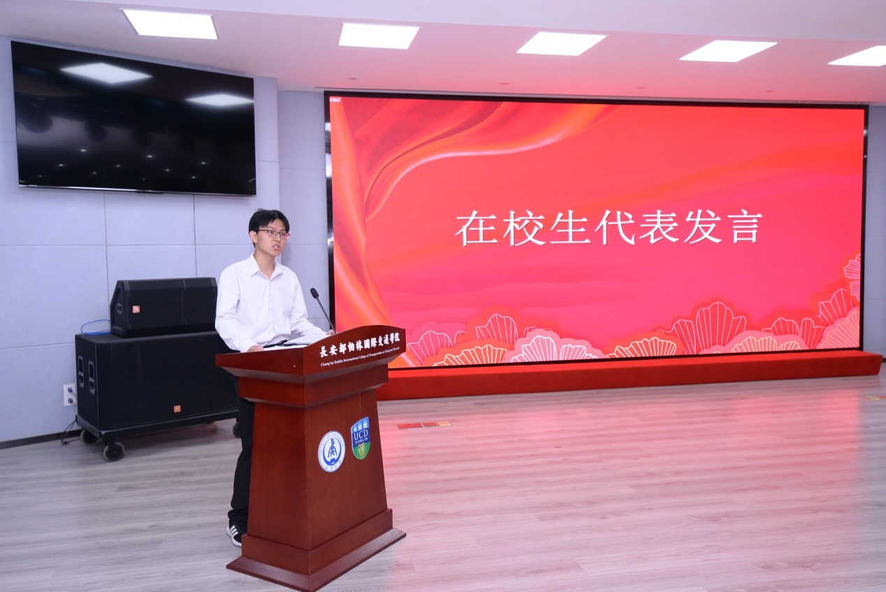 在校生代表、2020级数学专业曹震同学发言。他代表全体在校生向2022届学长学姐们表示衷心地祝福,祝贺他们顺利完成学业,开启人生新的征程。感谢他们在校期间对学弟学妹们的关心和帮助。