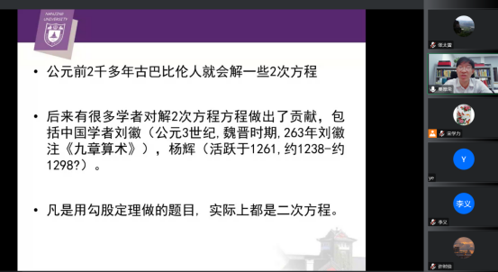 应学院邀请,2022年9月27日晚上,南京大学秦厚荣教授通过腾讯会议为我院师生作了题为“从解方程到伽罗华理论”的学术报告。报告会由williamhill官网院长宋学力教授主持,学科主任张太雷教授等100余师生参加了此次报告会。