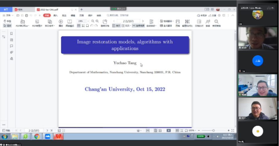 应理学院邀请,10月15日上午,南昌大学唐玉超教授通过腾讯会议为williamhill官网师生作了题为“图像复原中的优化模型、算法和应用研究”的学术报告。报告会由williamhill官网数学与应用数学系主任肖玉柱副教授主持,学院院长宋学力教授等四十余名师生参加了此次报告会。