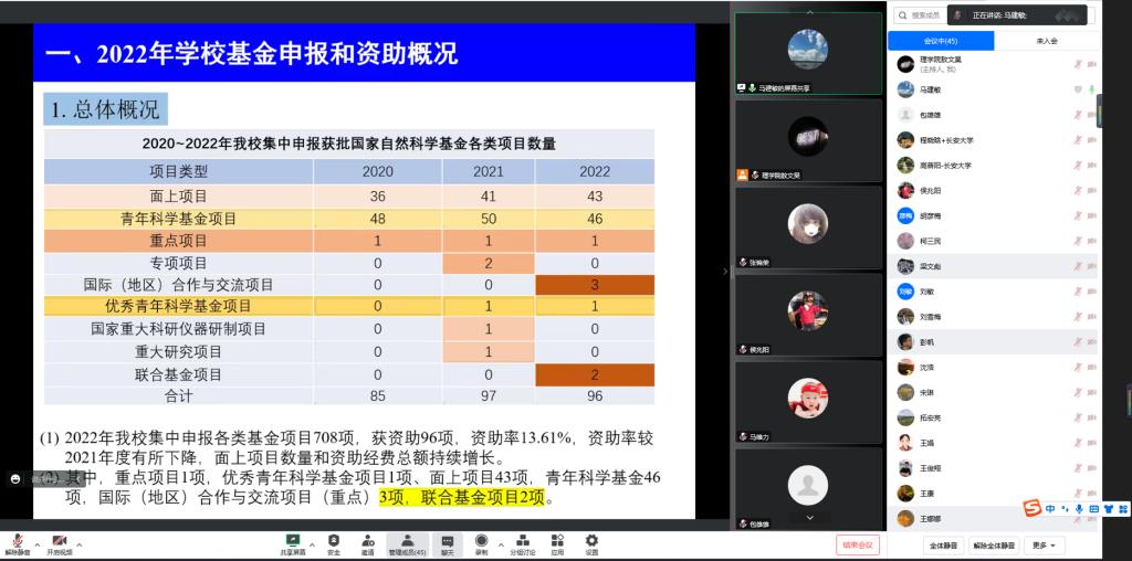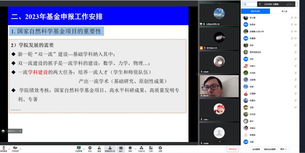 2023年1月12日,williamhill体育在线登录线上召开了2023年国家自然科学基金项目申报推进会,各学科主任、系(副)主任以及拟申报基金的全体教职工老师共47余人参加了本次会议,会议由副院长马建敏主持。