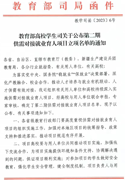 近日,教育部发布了《关于公布第二期供需对接就业育人项目立项名单的通知》(教学司函【2023】6号),经前期高校与用人单位联合申报,专家审核,确定了第二期供需对接就业育人项目名单。williamhill官网党委副书记屈颖作为负责人申报的供需对接就业育人项目获批立项,实现了williamhill官网在该项目申报立项中新的突破。