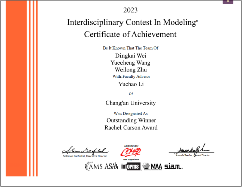 美国大学生数学建模竞赛(MCM/ICM)由美国数学及其应用联合会主办,是唯一的国际性数学建模竞赛,也是世界范围内最具影响力的数学建模竞赛,每年举办一届。比赛设有特等奖(O奖)、特等奖提名(F奖)、一等奖(M奖)、二等奖(H奖)、成功参赛奖(S奖)以及若干单项奖,其中单项奖“Rachel Carson Award”颁发给由ICM问题E的首席评委从该选题O奖获得者中选出的唯一团队,以表彰他们在建模中使用科学理论和数据的卓越表现。