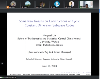 在报告中,刘宏伟教授首先回顾了子空间码的定义以及研究进展,接着详细阐述了他和合作者最近在循环常维数子空间码构造中的研究成果。刘宏伟教授为与会师生特别介绍了他们是如何利用一些Sidon空间构造出新的循环常维数子空间码,并且构造出的常维数子空间码的size比较大。在互动环节,在场师生踊跃提问,刘宏伟教授就大家提出的问题做出了精准的解答并和大家进行了深入的探讨,加深了与会师生对子空间码的理解。