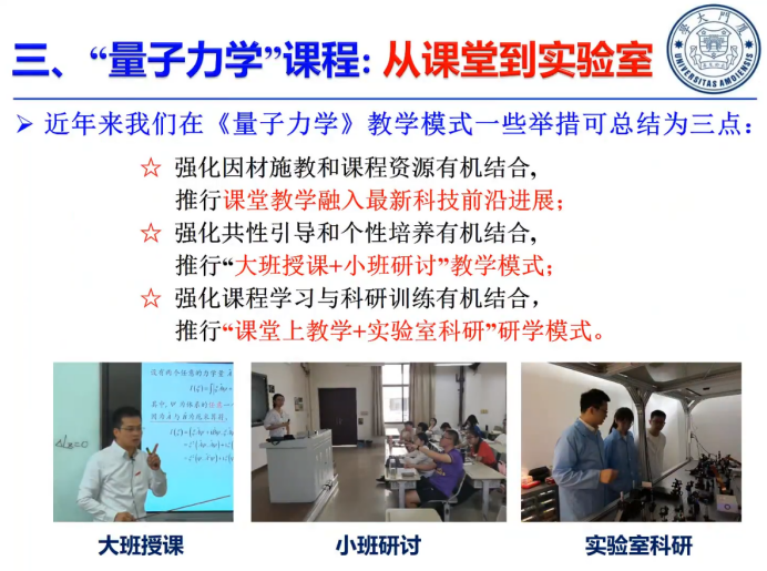 讲座中,陈理想教授从教育部拔尖计划2.0的时空背景、厦大物理拔尖人才培养的特色模式这两个宏观的维度,以及《量子力学》课程建设从课堂到实验室、再从前沿实验到思政教育这两个微观的维度,系统性地阐述如何实现拔尖人才培养与课程思政建设的融合融通、相辅相成。