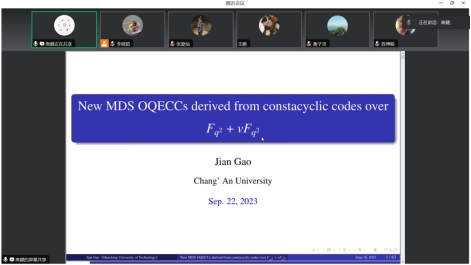 .”的学术报告。高健副教授首先阐述了算子量子纠错码通过在物理状态空间的子空间的张量因子中编码量子信息,可以有效地保护量子信息免受干扰,并构造了两个MDS OQECC的无限族。接着详细报告了他通过构造环上的常循环码,利用Gray映射得到了有限域上的循环码,再借助对偶包含码构造出了量子码。此外,高健副教授强调这些MDS OQECC的参数都是新的,不能被之前文献所构造的MDS OQECC包含。