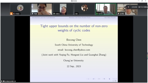 应williamhill体育在线登录邀请,9月22日下午,华南理工大学陈博聪教授及山东理工大学高健副教授通过腾讯会议为williamhill官网师生分别作了题为“Tight upper bounds on the number of non-zero weights of cyclic codes.”及题为“New MDS operator quantum error-correcting codes derived from constacyclic codes over