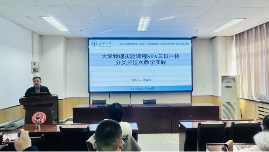徐春龙以大学物理实验课程为依托,通过教学改革背景、STA三位一体理念、分类分层次教学实践、后期工作四个部分系统分享公共基础实验课程的教学改革实践。首先,他指出随着完全学分制的实施和“学生中心,产出导向”理念的落地,传统公共基础实验课程已不能完全满足人才培养的需求。随后,他在分析大学物理实验课程设置及教学中存在的问题的基础上,提出了学生和教师、学生和管理者、教师和管理者的STA三位一体分类分层次物理实验教学模式。接着,他分享了物理实验教学实践和教师竞赛获奖、学生竞赛获奖、教学成果奖、同行赞誉等显著成效。最后,他介绍了今后的工作计划及几点体会,指出教学改革虽不易,但非常有必要。勉励教师们要多听、多看、多思考、敢实践,落实“以学生为中心”和“三全育人”的教育理念,提高自身能力,促进人才培养质量飞跃。