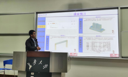 梁文彪就画法几何与工程制图课程中“钢筋混凝土梁配筋表达方法”一节内容进行示范讲解。他在教学过程中采用了建筑结构三维模型、二维图形及工程实际有机结合的方法,以提高学生的专业制图水平、专业认知能力和工程实践能力,达到学以致用的目的。同时,他在我国现行的结构平面整体表示方法(平法)、平法与国外表达方法对比及“一带一路”背景下平法的国际化应用的讲解中,还引入了“严谨细致的工作态度”、“工匠精神”及“民族自豪感”等思政元素,生动诠释了课程思政的展开方式。