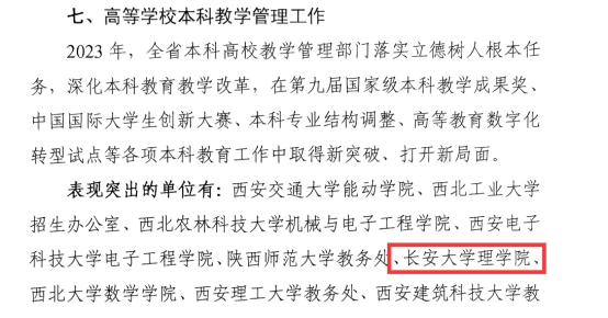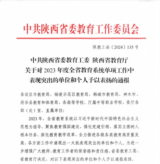 近日,中共陕西省委教育工作委员会 陕西省教育厅发布《中共陕西省委教育工委 陕西省教育厅关于对2023年度全省教育系统单项工作中表现突出的单位和个人予以表扬的通报》(陕教工函〔2024〕135号)。williamhill官网在第七项单项工作“高等学校本科教学管理工作”中表现突出被通报表扬。