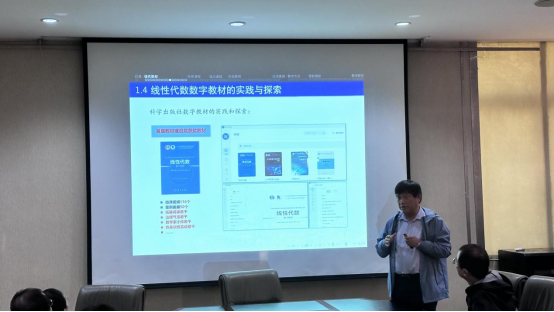 报告首先介绍东南大学线性代数课程的资源建设,包括新形态教材、先修课、MOOC、思政案例和应用案例;其次分享线上线下混合式教学的做法和人工智能辅助教学的一点探索;最后展示课程建设的成效和示范辐射作用。报告结束后,与会教师围绕报告内容展开了深入的探讨与交流。整场报告深入浅出,内容丰富有深度。