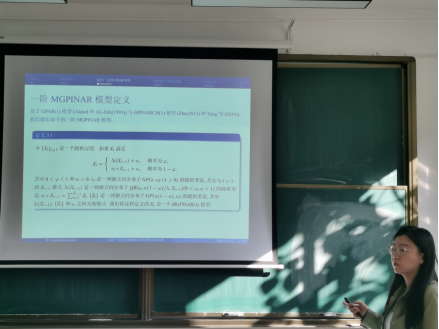 接着,黄洁通过介绍整数值时间序列数据的研究背景及经典模型的优缺点,展示针对经典模型已有的相关推广模型。结合现有模型的局限性,引出所提的混合广义泊松整数值时间序列模型及其基本的统计性质,并分别介绍了一阶和p阶混合模型参数估计和预测过程。通过两个实际数据例子,提出模型的应用场景及其优势。