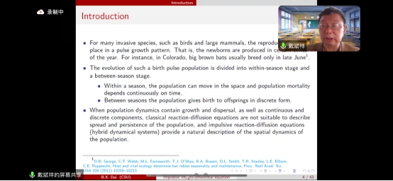 戴斌祥教授的报告主要讲解关于非局部扩散脉冲物种模型的空间动力学,该模型根据每年同步出现的成虫的现象建立了具有脉冲和非局部扩散的种群模型。在有界域的情况下,展示了成年种群的阈值动态,并提供了精确的持久性判据。在空间均匀无界域的情况下,得到了传播速度的存在性和计算公式,该速度与行波的最小波速一致。上述结果在成熟脉冲函数的单调和非单调情况下都得到了验证。