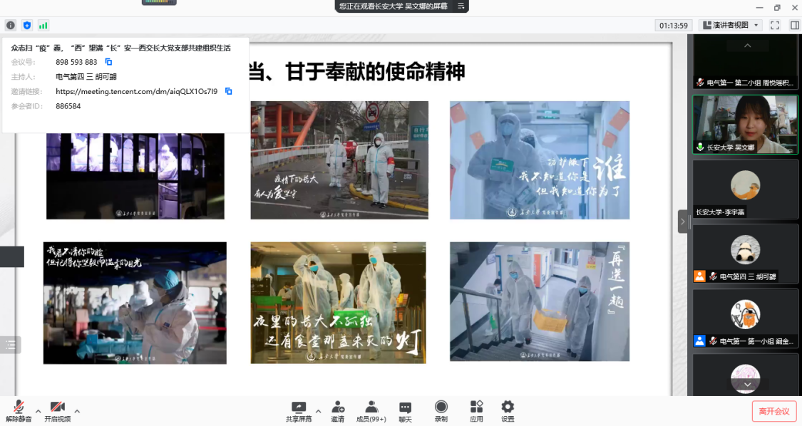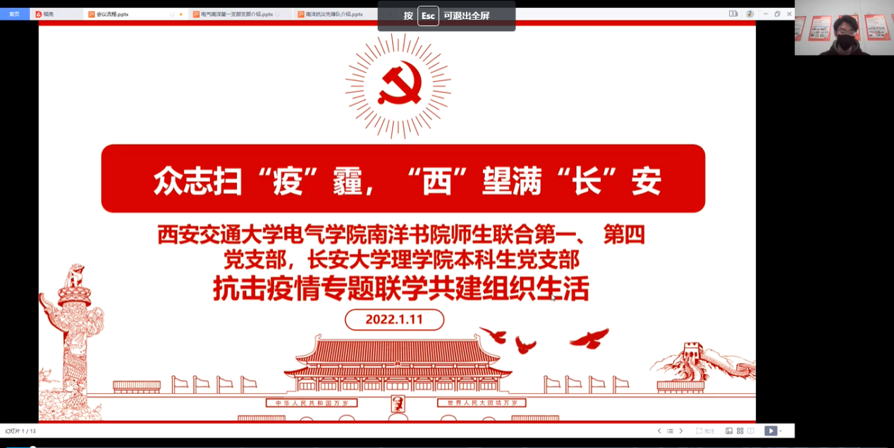 2022年1月11晚,williamhill体育在线登录本科生党支部、西安交通大学电气学院南洋书院师生联合第一、第四党支部通过腾讯会议共同开展“众志扫‘疫’霾,‘西’望满‘长’安”抗击疫情联学共建活动。西安交通大学南洋书院院务副主任、西安交通大学兴庆校区疫情防控学生志愿者临时党支部书记朱荣锋、williamhill体育在线登录本科生党支部书记刘延海,各党支部全体成员参加活动,活动由西安交通大学电气学院南洋书院师生联合第一党支部书记阚金鹏主持。