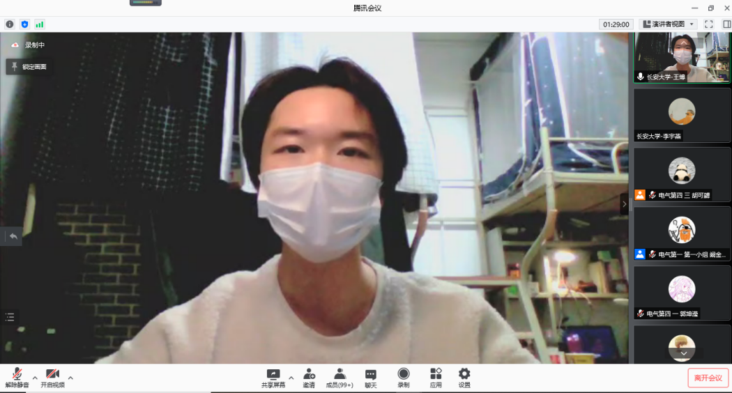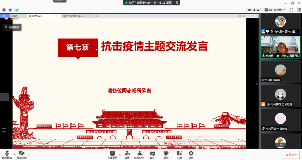 在致辞中,朱荣锋对与会党员表达了亲切问候,对抗击疫情中三个支部党员的表现给予肯定,号召党员进一步践行初心使命,让党旗在疫情防控一线高高飘扬。刘延海介绍了williamhill体育在线登录本科生党支部在抗击疫情中的主要工作,讲解了本次抗击疫情联学共建活动的意义,希望三个党支部互学互鉴,携手共进,在抗击疫情中充分发挥党员的先锋模范作用。随后,各支部分别介绍了本支部的情况。在活动中,西安交通大学电气学院南洋书院师生联合第四党支部胡可勰领学了习近平主席二〇二二年新年贺词,williamhill体育在线登录本科生党支部朱悦领学了习近平总书记在全国抗击新冠肺炎疫情表彰大会上的讲话。西迁精神宣讲团成员周悦瑶和长安星火宣讲团成员吴文娜分别宣讲了伟大抗疫精神。两校党员志愿者阚金鹏和王博分别分享了疫情期间志愿服务经历。三个支部成员围绕抗击疫情主题进行了交流发言。最后,西安交通大学南洋书院党总支学生副书记胡可勰进行了发言,表达了各党支部继续深化交流合作的意愿。