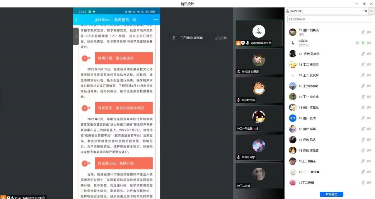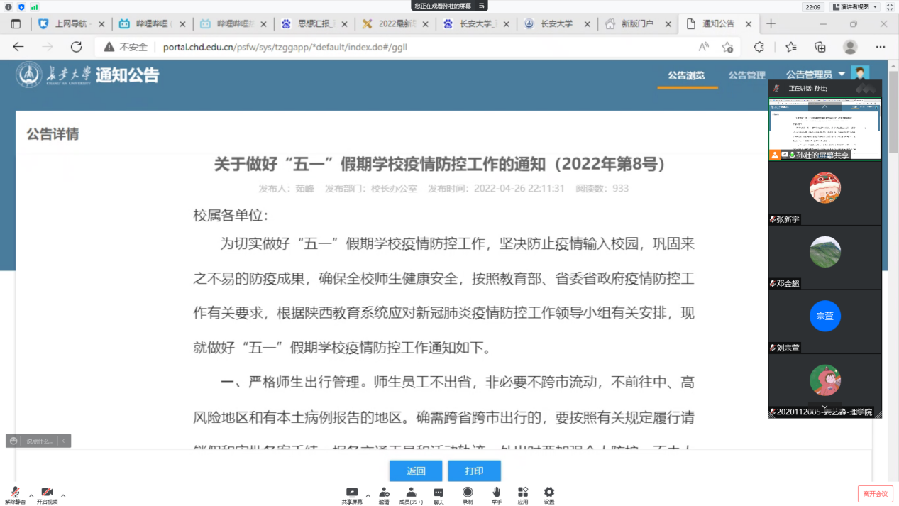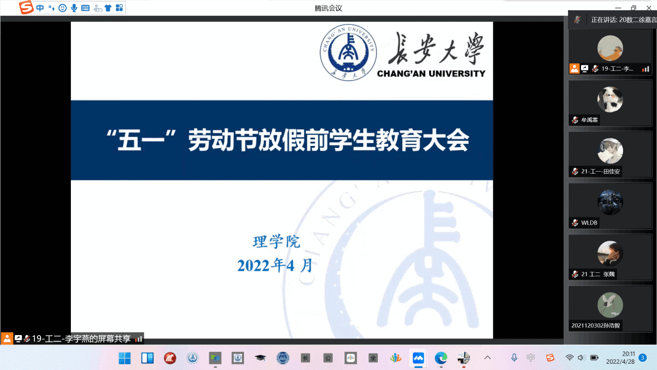 根据学校《关于做好“五一”假期学校疫情防控工作的通知(2022年第8号)》和《关于做好2022年“五一”劳动节放假期间学生工作的通知》,为做好2022年“五一”劳动节期间有关学生工作,保障学生生命安全和身体健康。4月27日,28日晚,williamhill体育在线登录通过腾讯会议分别组织召开了研究生、本科生各年级教育大会。学院党委副书记屈颖、辅导员汤颖颖、刘延海,全体研究生、本科生分别参加了会议。