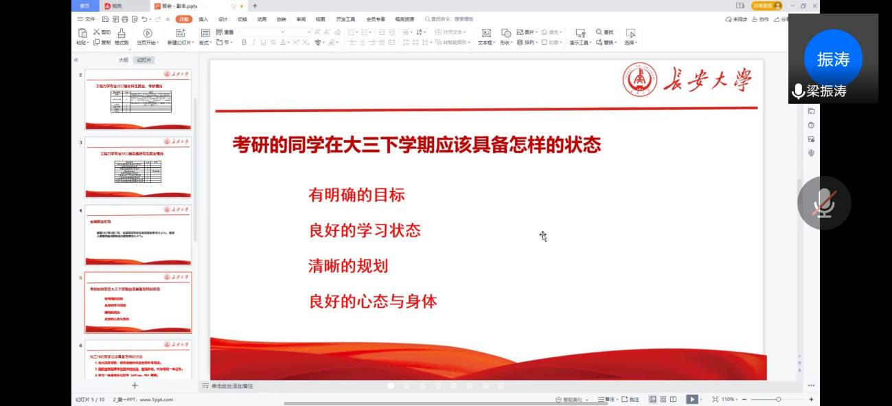 最后,梁振涛对会议进行了总结。他结合对近年来学院工程力学专业本科生、研究生的毕业去向数据统计,逐个解答了前期收集到的同学们的问题,对考研及找工作的同学针对性地提出了不同的状态建议,倡导大家坚持学习、坚持阅读、坚持锻炼、摆脱拖延症,实现自我的身心健康与自我提升。