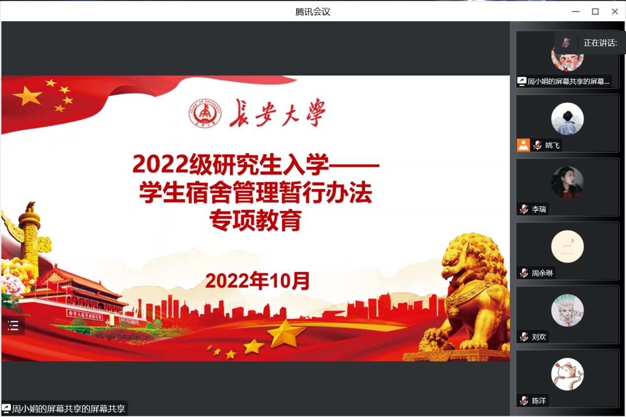 为了增强学生宿舍安全意识,促进新生适应宿舍学习生活和遵守学校社区相关管理制度,10月8日,williamhill体育在线登录通过腾讯会议召开2022级研究生新生教育工程之学生社区管理暂行办法专项教育,会议由研究生辅导员周小娟主持,全体2022级研究生新生参会。