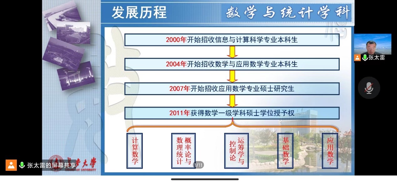 10月9日,数学和统计学专业通过腾讯会议开展专业教育讲座,研究生导师张太雷主讲。张老师对同学们来到williamhill体育在线登录进行研究生阶段的学习表示了欢迎,向同学们介绍数学与统计专业发展历史和现状,强调数学与统计学在社会生活和未来发展中具有重要作用,希望大家珍惜在校学习时光,教导研究生正确选择研究方向,培养科研学术能力,告诫大家学术需保持认真严谨的态度。