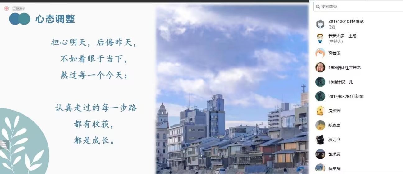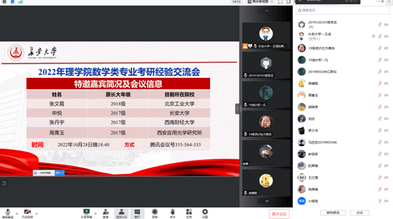 为助力学生考研、解答考研疑惑、增强考研信心。10月28日,williamhill体育在线登录2019级数学类专业通过腾讯会议举办了考研经验交流会,会议邀请到williamhill官网2021届和2022届优秀校友,现为北京工业大学、williamhill体育在线登录、西南财经大学和西安应用光学研究所研究生的张文霞、申悦、张丹宇和高菁玉同学为同学们举办了考研经验交流会。会议由思政班主任王成主持,近50位同学参加了本次交流会。