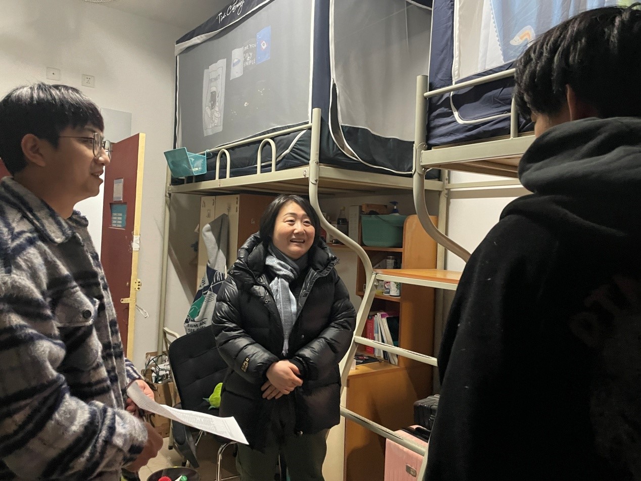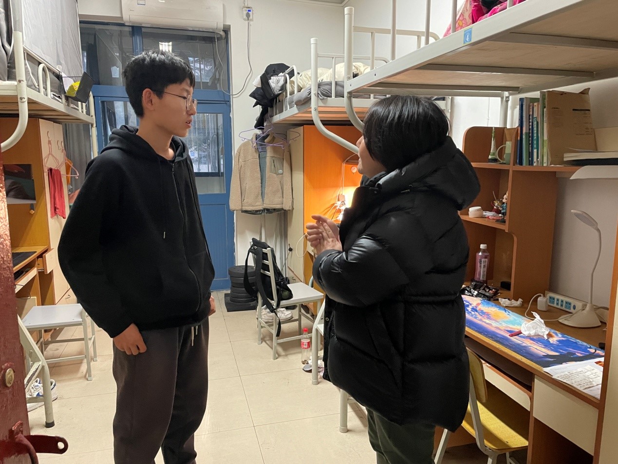 在走访过程中,院领导与学生进行了亲切交流,询问同学们在本学期的学习生活中有无困难,了解同学们的假期安排和出行计划,如需帮助可随时联系学生工作办公室。指出同学们要加强自我防范意识,自觉遵守宿舍各项管理规定,坚决杜绝宿舍内违规用电等违纪行为,保持室内通风,共同维护宿舍卫生环境。最后叮嘱同学们离校时要断水断电,保管好自己的贵重物品,假期出行要注意安全。