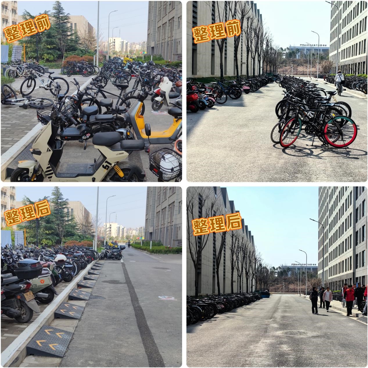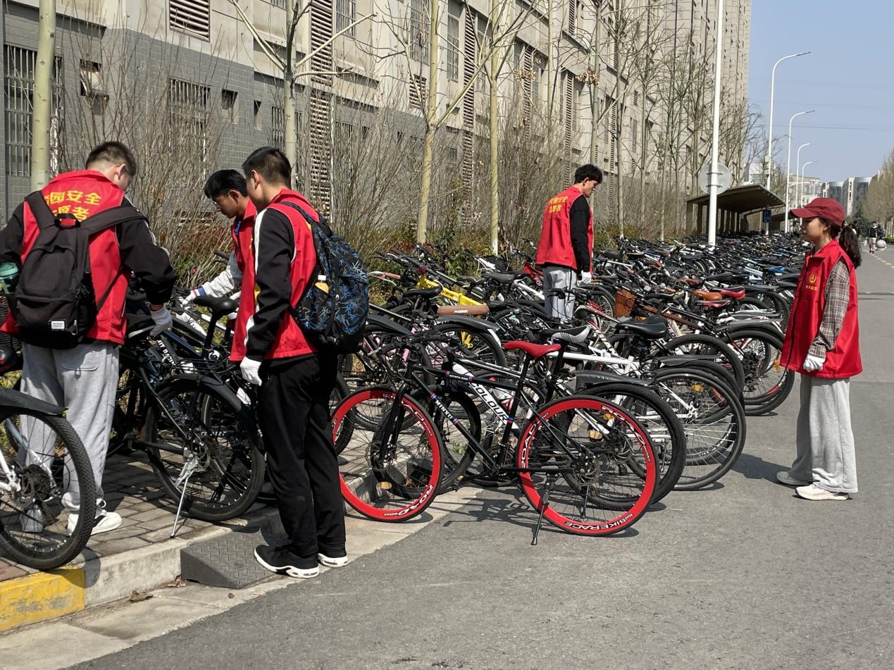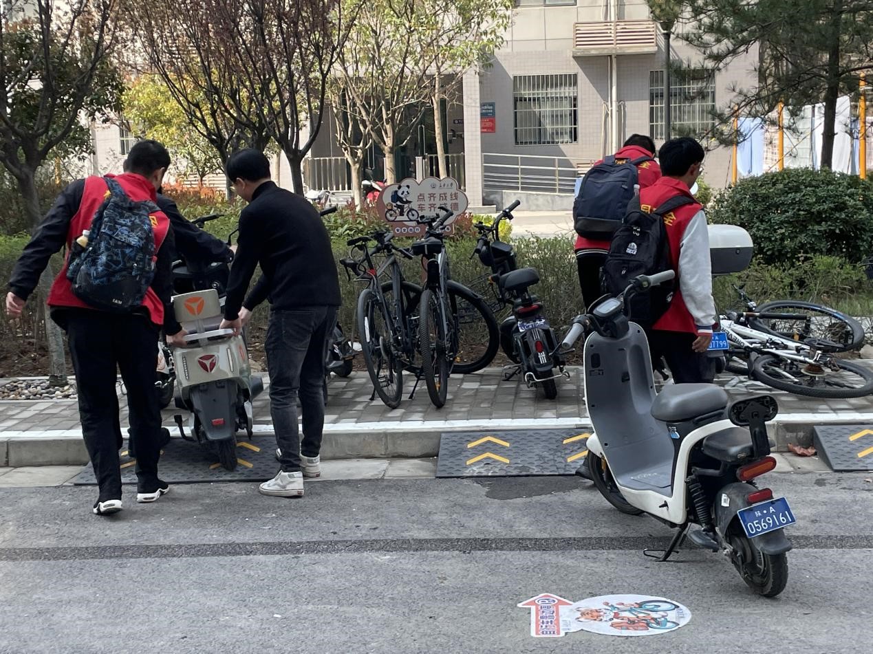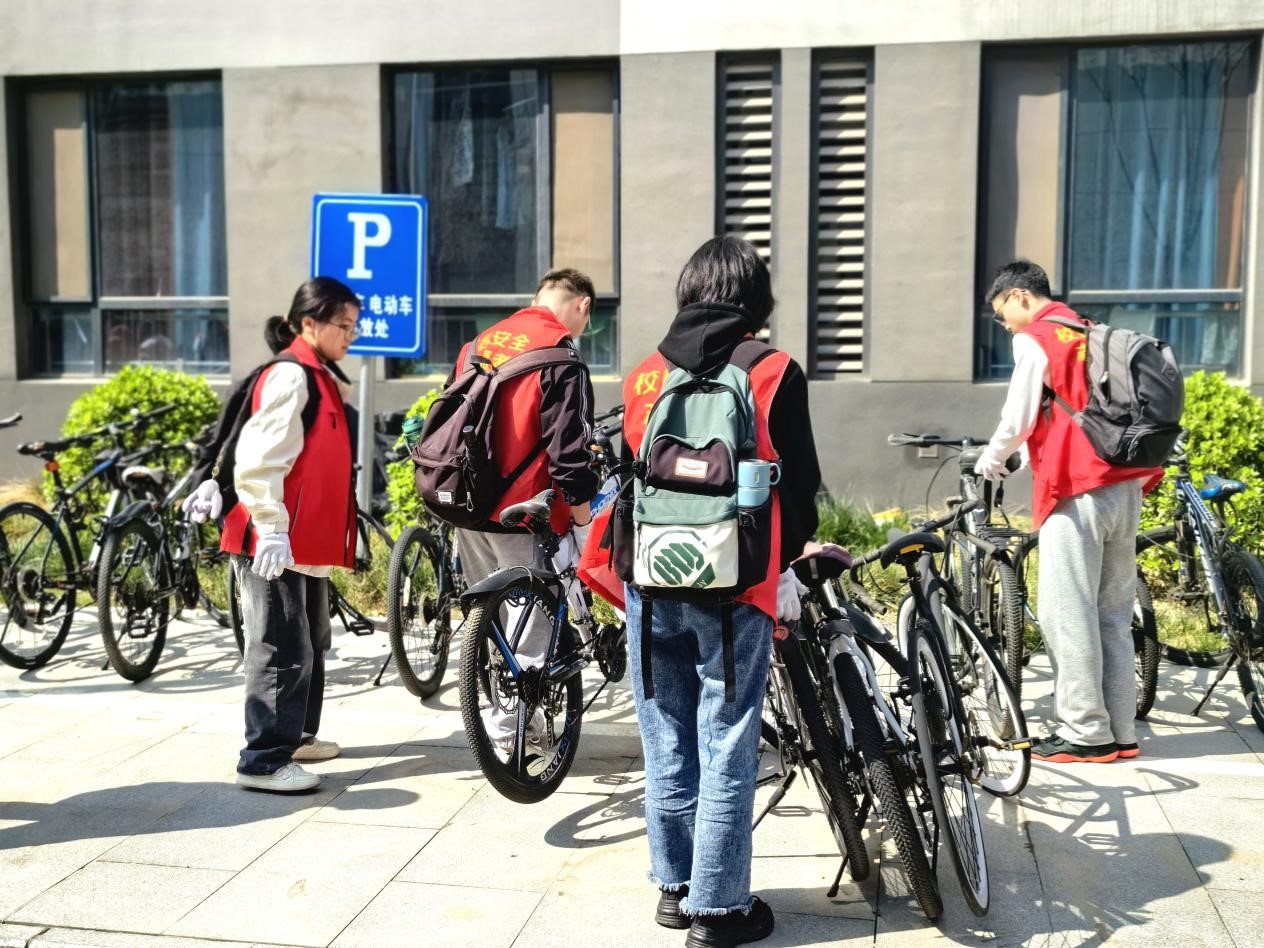 志愿者们参与活动积极投入、认真负责,在19号宿舍楼下集合、分组、分工,对停车未入位、占用机动车道及乱停乱放的车辆进行逐一规范整理,用实际行动帮单车“归位”。同时向学生宣传规范的单车停放方式和校园交通规定,号召全体师生共同维护有序、整洁的校园环境。
