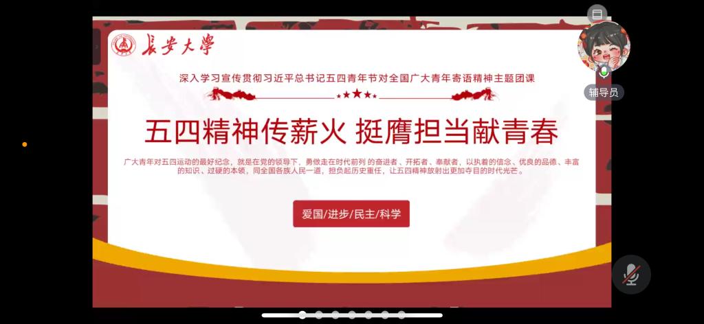为深入学习宣传贯彻习近平总书记五四青年节对全国广大青年寄语精神,引导同学们树立正确的世界观、人生观和价值观,增强社会责任感和使命感,5月20日晚,williamhill体育在线登录研究生通过腾讯会议组织开展了“五四精神传薪火 挺膺担当献青春”主题团课。团课由辅导员周小娟主讲,全体研究生参会。