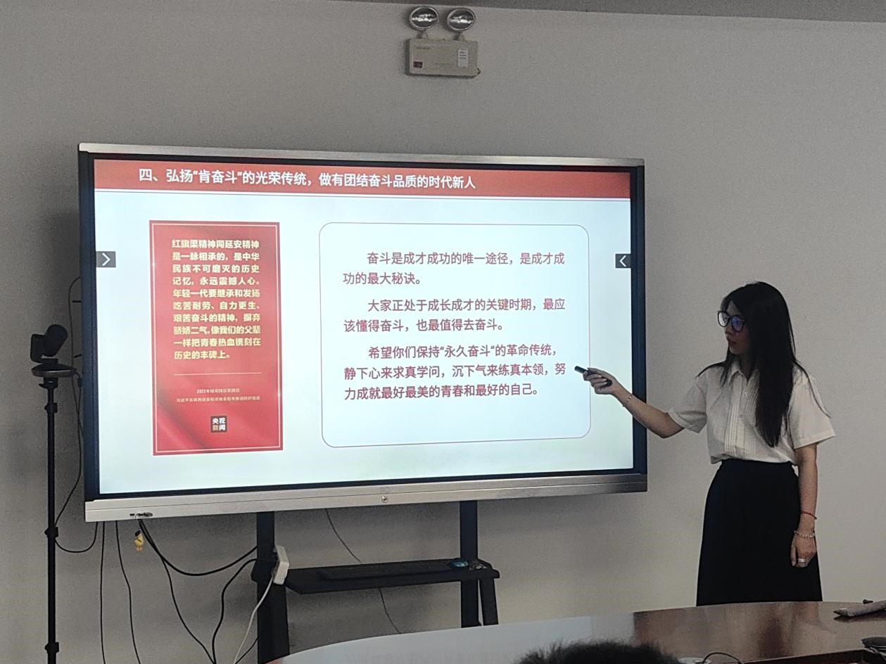 姜雨彤从有理想、敢担当、能吃苦、肯奋斗四个方面讲述了新时代青年的责任和使命,带领同学们学习了在志愿服务、科技创新等领域涌现出的青春榜样的先进事迹,鼓励同学们坚定理想信念,紧密团结在党的周围,以党的二十大精神为指导,不断提高自身素质,实现青春和时代的双向奔赴!