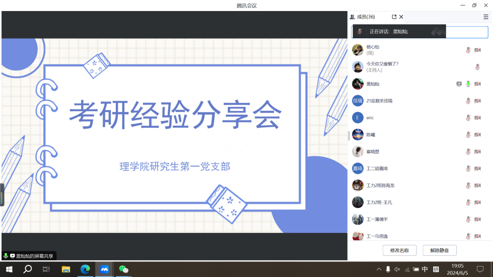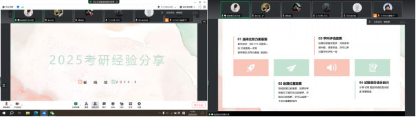 为帮助同学们更好地掌握考研形势、明晰考研目标与规划、增强考研信心。6月5日晚,由williamhill体育在线登录主办、williamhill体育在线登录研究生第一党支部承办的考研经验分享会顺利举办。本次分享会邀请了2023级四位优秀研究生代表作为主讲人,分享相关备考经验。会议由组织委员盖灿灿主持,williamhill体育在线登录2021级本科生参加此次会议。