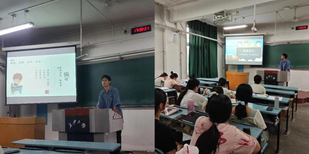 会上,孙东生带领大家一同学习了诚信考试的相关知识,强调了诚信考试的重要性,并将诚信理念与学风建设紧密结合,使每一位同学都深刻认识到,诚信是学风建设的基石,是每一位学子成长成才的必由之路。他结合考试违纪案例介绍了《williamhill体育在线登录学生违纪处分规定》中列举的考试违纪行为,诸如:携带与考试内容相关的文字材料或者存储与考试内容相关资料的电子设备参加考试,抄袭或者协助他人抄袭试题答案或者与考试内容相关的资料;在考试过程中旁窥、交头接耳、互打暗号或者手势等。会议最后,他着重强调了近期举行的四六级考试和期末考试,大家务必诚信应考,严禁任何作弊行为,提醒大家需严谨对待,认真应考。