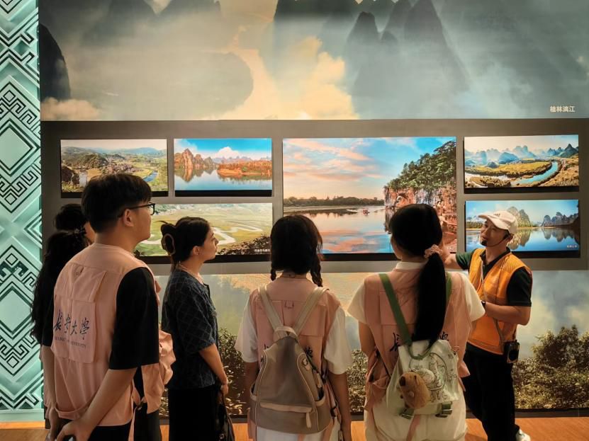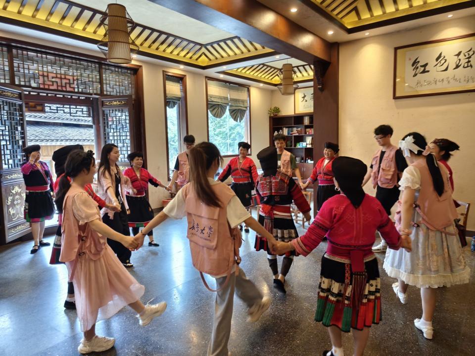 以文塑旅、以旅彰文,一部中国史就是一部各民族交融汇聚成多元一体中华民族的历史。实践队走进桂林市龙胜各族自治县泗水乡周家村,聆听民族团结一家亲的故事。讲解员秦新发向实践队介绍了村寨的历史文化并讲述了长征时期红军与红瑶民众联手抗敌的英勇故事。在村寨中,身着特色民族服饰的居民们邀请实践队员们品油茶、对瑶歌、跳民舞,在热烈的氛围中队员们深切感受到村寨的民族特色和团结底色,青山绿水间浓郁的民族文化成为一道美丽的风景线。走入“甘地柴窑”工作室,队员们在交流体验中感受红陶的独特魅力,体悟非遗传承人十年如一日的匠心精神。在生态文明实践培训基地,队员们就习近平总书记的生态治理理论展开学习与讨论,在“两个结合”中探寻传统文化在生态文明建设中焕发出的新光彩。