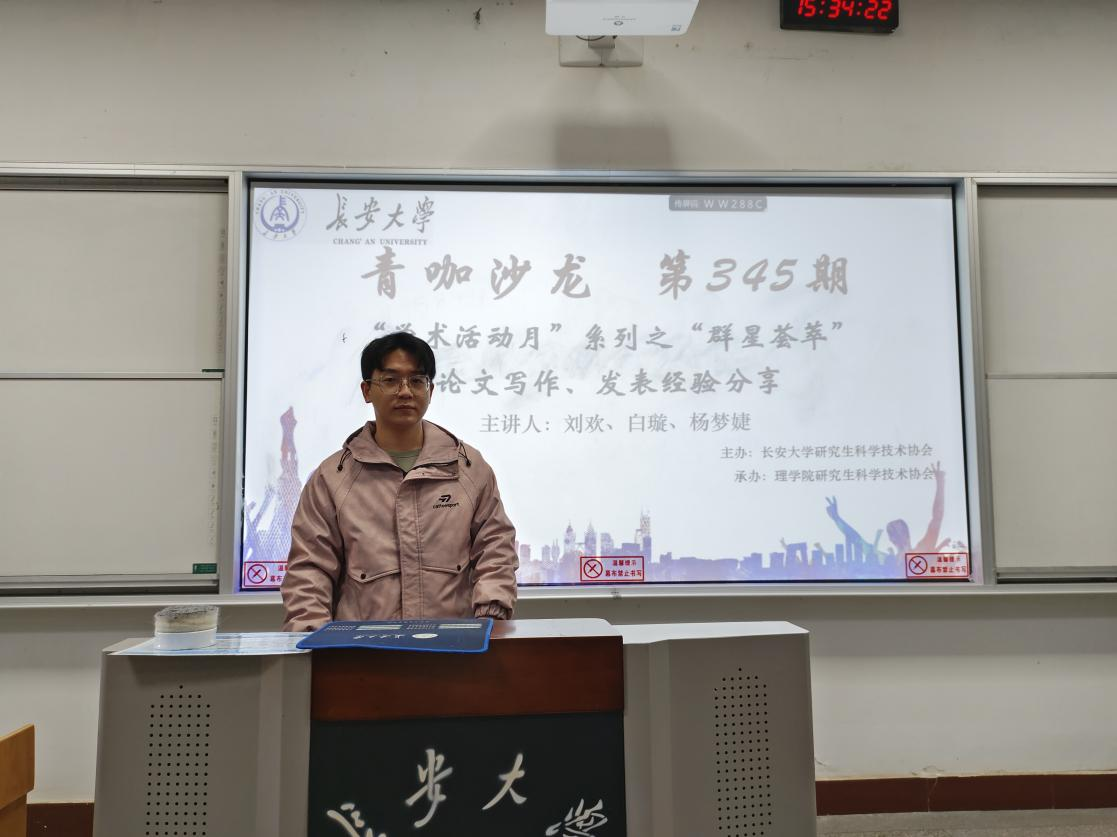 12月4日,由williamhill体育在线登录研究生科学技术协会主办,williamhill体育在线登录研科协及研会共同承办的研讨系列青咖沙龙第345期“论文写作、发表经验分享”在南校区北院103教室举办。本次研讨系列青咖沙龙由williamhill体育在线登录数学专业2022级硕士研究生杨梦婕同学、数学专业2022级硕士研究生白璇同学和力学专业2022级硕士研究生刘欢同学担任主讲人,共30余名研究生参与。