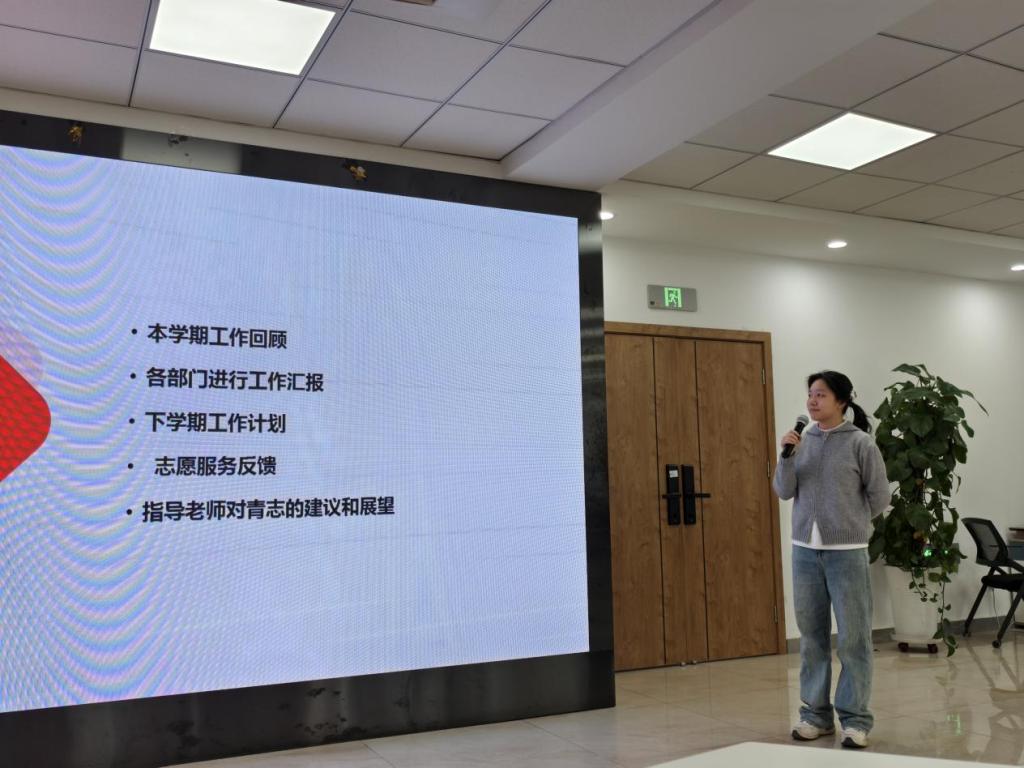 会议伊始,青志队执行主席刘梦莎发言。她对本学期工作成果进行了回顾与总结,带领大家一起深入反思工作中存在的不足并提出了切实可行的改进措施。