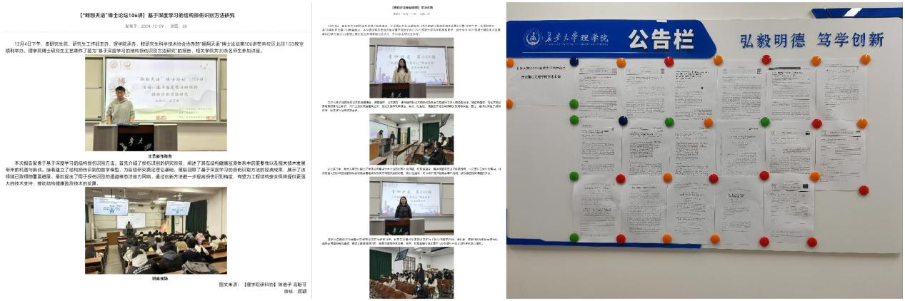朋辈之间的相互激励正成为推动学生个人成长和学术进步的重要力量。活动期间,学院研科协组织开展“博士论坛”、“青咖沙龙”、学术长廊系列活动。12月4日,博士研究生王艺霖作了题为“基于深度学习的结构损伤识别方法研究”的报告,聚焦于基于深度学习的结构损伤识别方法。通过创新方法进一步提高损伤识别精度,为工程结构安全保障提供更强大的技术支持,推动结构健康监测技术的发展。硕士研究生杨梦婕、白璇和刘欢都以亲身科研历程为例,讲述如何挖掘独特选题,强调创新与实践结合,分享了构建逻辑框架、处理难点及善用文献的方法,鼓励大家在科研中保持好奇与探索精神,积极参与学术活动,挖掘自身潜力,向着学术高峰奋勇攀登。12月11日至16日,学院还开展了长安智汇之学术长廊活动,在学院展览墙展示优秀学术论文、专利等。通过系列活动,充分发挥学生身边榜样示范引领作用,激发研究生科研热情。