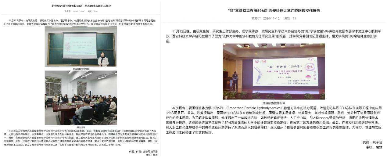 11月12日晚,学院邀请西安科技大学许晓阳教授作了题为“流体力学中的SPH数值方法研究进展”的报告,许晓阳教授主要围绕流体力学中的SPH(Smoothed Particle Hydrodynamics)数值方法中的核心问题、改进的方法和SPH方法在实际工程中的应用三个方面展开,为模型、算法与实际工程应用之间搭建了坚实的桥梁。11月13日下午,学院邀请湖南大学侯淑娟教授作了题为“结构的冲击防护与优化”的报告。侯淑娟教授主要围绕汽车碰撞安全性中的结构冲击防护与优化问题两方面展开,开发了复合吸能结构制备新工艺,实现了固废循环再利用的可持续制备,并且致力于推广应用。两位教授的报告激发了全体研究生对于科研工作的热情与兴趣,为提高学生学术创新能力建设,打造学术交流平台奠定了良好基础。