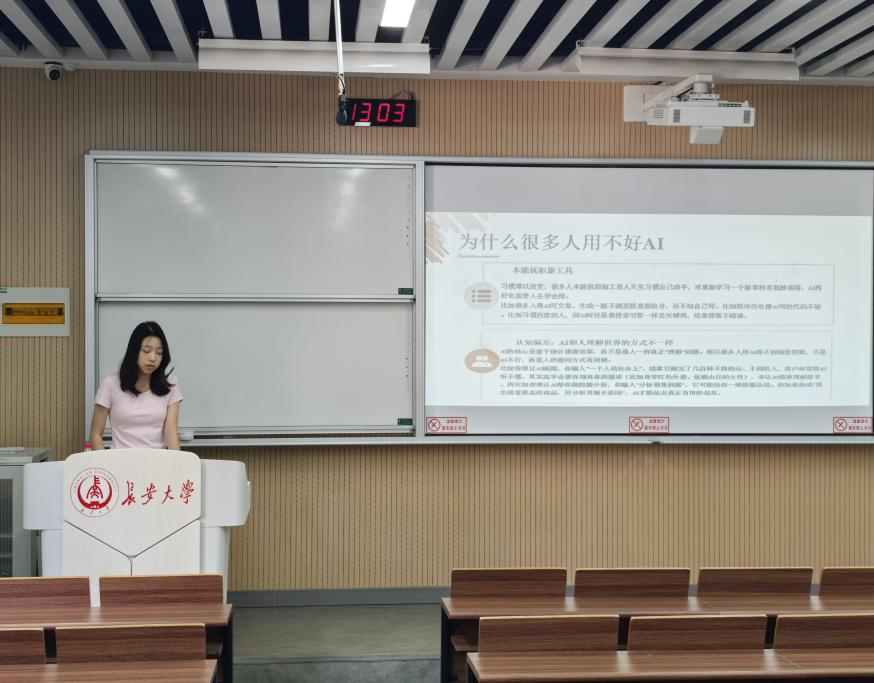 韩钰萱和程若水两位同学分享了自己的学习心得体会。韩钰萱同学从AI时代大家面临的困境出发,结合自身在探索过程中的具体案例,生动地展示了AI的实际应用。程若水同学向大家分享了“百大AI应用”网站,并挑选其中的一个网站进行详细说明和现场演示,为同学们提供了丰富的学习资源和参考。