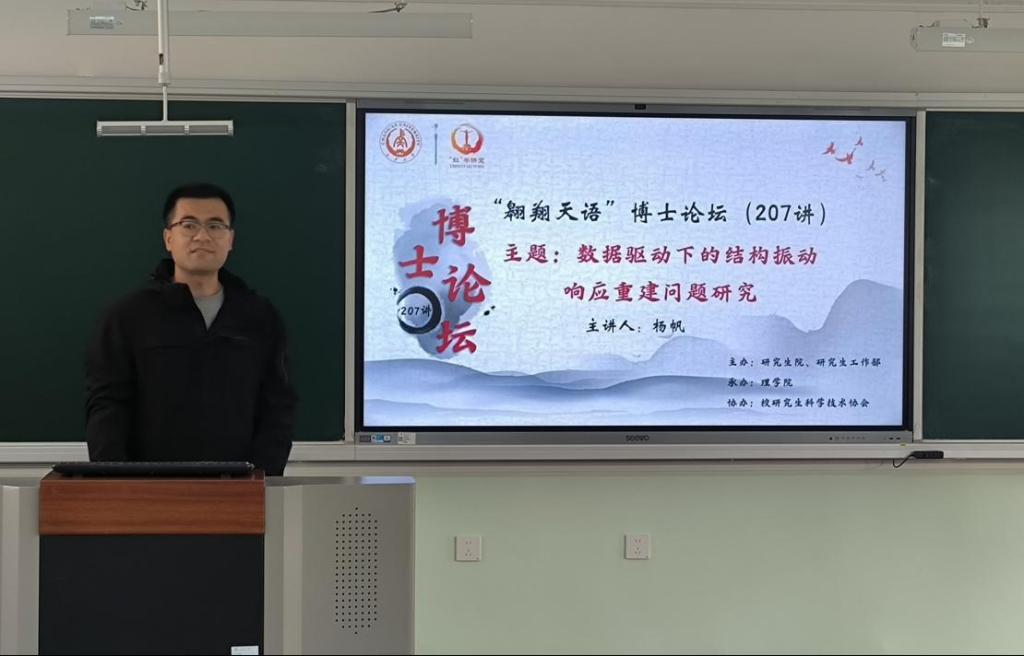 11月12日下午,由研究生院、研究生工作部主办,williamhill体育在线登录承办,校研究生科学技术协会协办的“翱翔天语”博士论坛第207讲在南校区北院B403教室顺利举办。williamhill体育在线登录博士研究生杨帆作了题为“数据驱动下的结构振动响应重建问题研究”的报告,共70余名师生参加了论坛。