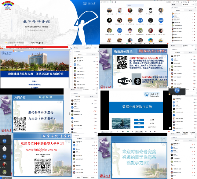 在两天的活动中,来自多所高校的数学、应用数学、统计学、数据科学等专业的同学云端相聚,共同聆听了学科总体介绍与多个研究方向团队的详细宣讲。首日晚,赵楠楠老师首先介绍了williamhill体育在线登录数学学科的基本情况、发展历程与未来规划。随后,宋学力教授团队就“数据建模方法与应用”展开介绍,衡子灵教授团队分享了“数据编码”的研究进展与成果。在自由交流环节,同学们积极提问,老师们耐心答疑。第二天的活动继续聚焦科研团队介绍,郑素佩教授团队、王长鹏副教授团队、包雄雄教授团队及刘敏副教授团队分别就“现代科学计算理论与方法”、“数据分析理论与方法”、“生物信息处理与建模”和“基础数学”等方向进行宣讲,充分展现了williamhill体育在线登录数学学科多领域、高水平的科研布局与人才培养环境。集中答疑环节通过问答的方式进一步增进了学生对各个导师、校外学生对williamhill体育在线登录的了解。