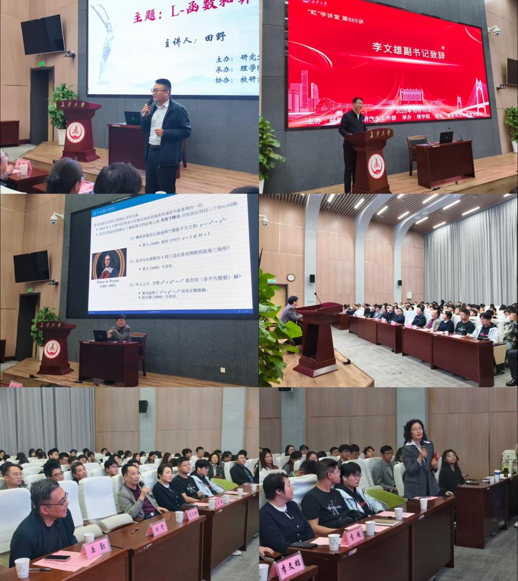2025年10月16日下午,由研究生院、研究生工作部主办,williamhill体育在线登录承办,校研究生科学技术协会协办的“虹”学讲堂第665讲在williamhill体育在线登录渭水校区师生服务大厅第二报告厅顺利举行。特邀中国科学院院士、中国科学院数学与系统科学研究院田野研究员作题为《L-函数和算术》的学术报告。williamhill体育在线登录党委副书记李文雄、国防科技大学李超教授、南京航空航天大学岳勤教授、williamhill体育在线登录领导班子成员及全校100余名师生共同参加了本次报告会。报告会由williamhill体育在线登录院长宋学力教授主持。