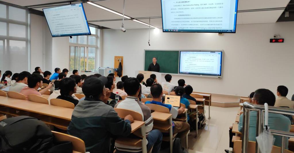 夏纪真先生以深厚的学术底蕴和丰富的行业经验,从六个方面为师生带来了一场内容翔实、深入浅出的精彩报告。他首先介绍了无损检测技术的基本概念及其在现代工业中的重要作用,强调了该技术在航空航天、机械制造等关键领域中的不可替代性。随后,他结合自身多年的一线实践和教学科研经历,深入剖析了无损检测专业的就业方向与当前就业形势,为同学们的未来职业规划提供了清晰指引。