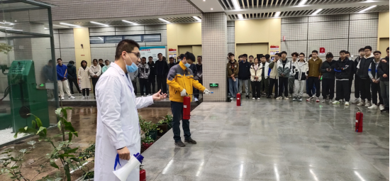 清点人数后,实验中心的丁健、崔林、李新波老师在一楼中厅分别对灭火器、消防水带的使用操作进行了详细的讲解和示范演示,参演师生围绕在花坛两旁进行了观摩学习。