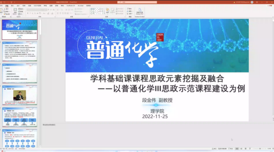 教学经验分享讲座由青年教师段金伟副教授主讲,以“学科基础课课程思政元素挖掘及融合——以普通化学III思政示范课程建设为例”为题分享了在课程思政建设方面的做法和经验。在一个半小时的分享中,段金伟首先对课程思政的缘起、发展、取得的成果和面临的问题进行了简单介绍;随后分析了学科基础课的共性,认为普通化学III的做法可供其他学科基础课参考;结合国家大政方针、教师职业发展、学生个性特征等方面分析了学科基础课课程思政元素挖掘及融合的重要意义;通过实例展示了课程思政元素的挖掘与融合过程,以及开展课程思政建设的思路和途径;最后,通过“大国工程中的防腐技术—以港珠澳大桥为例”的具体案例分享,演示了如何把课程思政与教学设计相结合,并融入到课堂教学的每一个环节。