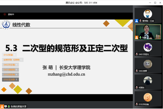 教学公开(观摩)课由青年教师张萌副教授主讲,题目为“《线性代数》课程——二次型的规范形及正定二次型”。在一个半小时的课程中,张萌先通过四个问题引导学生深入认识和剖析了二次型的规范形的定义、内涵和注意事项,并运用williamhill体育在线登录在线学堂平台与学生互动,通过随堂测试、提问等方式了解和掌握学生实时的学习状态;随后通过“举例说明、发现问题、分析问题、解决问题”的教学设计引导学生掌握正定二次型的定义、一步步分析和探索出常见结论和判定定理,最后再利用一题多解帮助学生巩固所学。