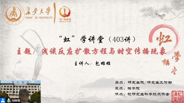 11月24日晚上,由研究生院/研究生工作部主办、williamhill体育在线登录承办、校研究生科学技术协会协办的“虹”学讲堂第403讲以线上讲座形式顺利举办。williamhill体育在线登录包雄雄教授作了题为“浅谈反应扩散方程与时空传播现象”的报告,williamhill体育在线登录党委副书记屈颖主持,相关学院共340余名师生参加讲座。