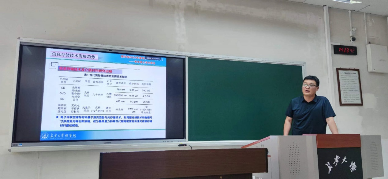 张翔宇博士结合自己近年来的科研工作作了题为《无机发光材料性能调控及在高端防伪和信息存储领域的应用》的报告,报告从四个方面分别介绍了稀土掺杂系列发光材料的理论基础、制备方法、性能测试、应用前景及研究成果,报告内容丰富翔实,与实际应用结合紧密,引起现场老师的兴趣,大家并围绕研究工作进行了充分讨论。