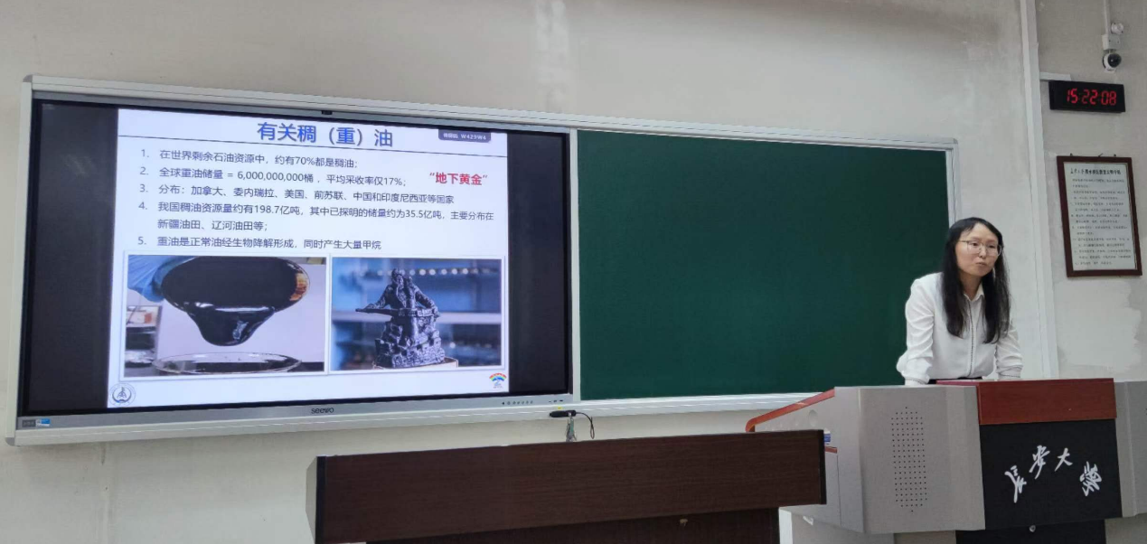 刘妍博士以《稠油火驱开发过程的化学反应及改质效果评价》为题,结合自己近年来开展的科研课题进行了报告,从石油开采方法、稠油火驱技术的特点、火驱技术对油品的化学反应及评价方法等方面结合生产油井的实际检测数据进行了详细报告,增加了师生对地质结构和石油开采方面的感性认识及火驱开采稠油方面科学研究的了解。