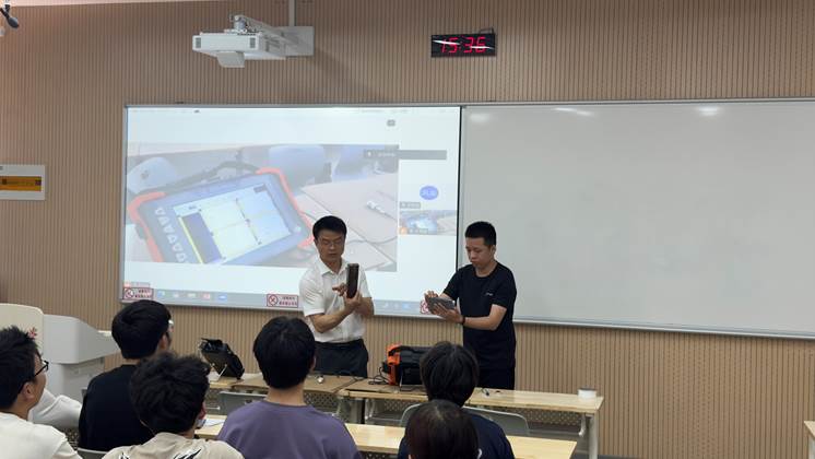 本次活动特邀广东汕头超声电子股份有限公司市场部高级经理周靖宇担任主讲嘉宾。周靖宇以行业资深从业者的视角,围绕无损检测行业应用范围展开深入讲解,通过对特种设备、石油化工、风电、桥梁等多个领域的实际案例和不同检测方法比对,让师生们对该技术的广阔应用前景有了具体了解。还介绍了超声检测从早期的模拟超声检测,到如今的数字化超声检测;从传统A扫描,发展到实现三维图像显示的相控阵成像技术,再到多模态组合检测技术的技术革新历程,分享了行业最新的技术动态与发展趋势。利用所携带的专业检测仪器,现场演示了超声A扫描检测与相控阵成像扫描检测过程,动态的检测画面、实时的数据反馈,让在场师生对超声检测技术应用有了直观且立体的认识。